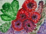 2006De linkse zonnebloem is de Neanderthaler, de rechtse is de Homo Sapiens en de middelste is een samensmelting hiervan. Het schilderij is in trance geschilderd.